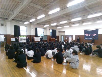 19日には私立高校入試を控えた生徒を体育館に集め、受験当日に気をつけなくてはいけないことなど話をしました。
